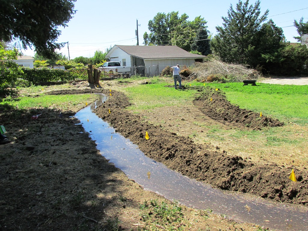 First we used a transit level to mark out a level line, or a line on contour in the landscape. It’s marked with yellow flags in the pictures. Our backyard is pretty flat, but it still has a lot of hills and flat spots you don’t see unless you are out there with the level. The line we marked was nice and pleasingly curved. Several time Joe asked if it was really necessary to worry about an inch in grade. I said yes. Getting the first line right on contour both made for nice curves and made the water flow far more even than it would have been otherwise. If it wasn’t exactly level, we might have had to go back and re-dig or dam some areas up.