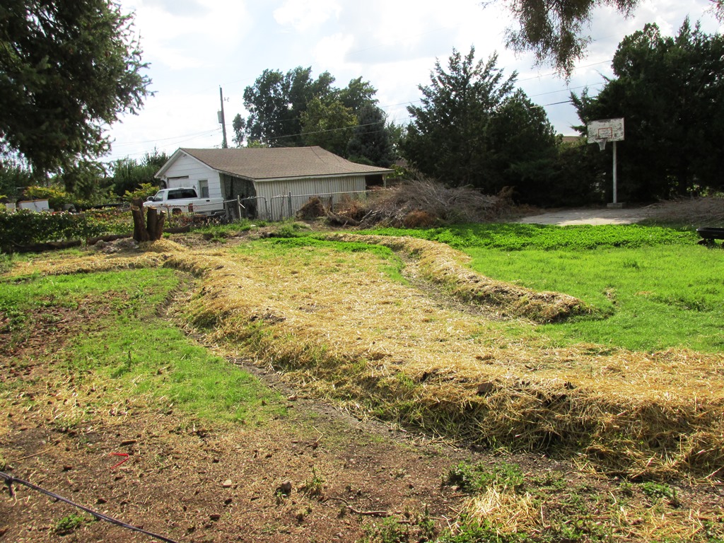In the backyard, I wanted a place to extend the garden with vegetables at first and more perennial crops like a food forest later. I wanted to take greater advantage of the water turn, not spend a lot of money, and also make it look nice. What I ended up planning on was two beds on contour (or flat), with a ditch or swale in front for the water turn, and a hugelkultur mound behind. I’m going to walk behind what we did so it makes sense.