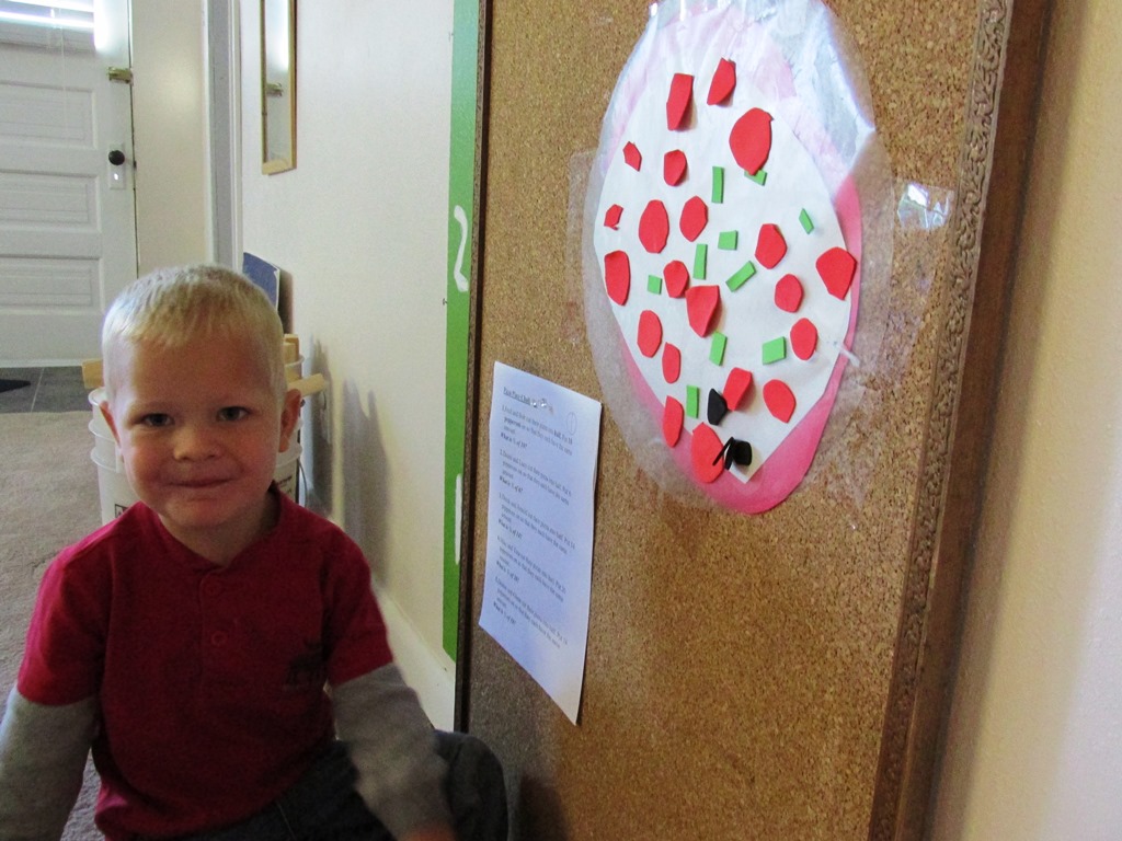 I usually let PB pick our theme for the week for school. Last week, I gave him a bunch of ideas and he picked Pizza. It was a great way for him to work on fractions. We used these worksheets, and make three different types of pretend pizzas, as long as the real thing for dinner one time. We also read Pete’s a Pizza, which might be one of PB’s favorite books. He likes to be made into a pizza as well as the main character in the book.