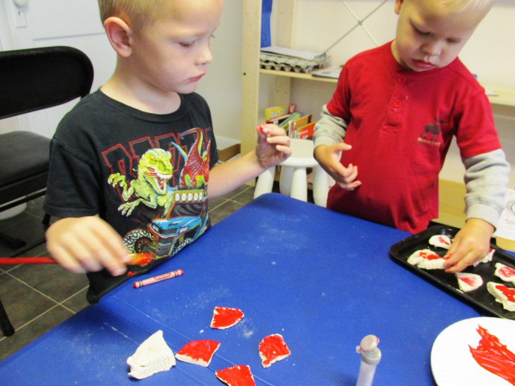 For this craft, on the first day I made salt dough. C just played with the dough and kept putting it in his mouth. PB made a couple of pizza crusts and so did I. We let them dry for a couple of days, and then painted them with red paint for the sauce and sprinkled white glitter on for the cheese.