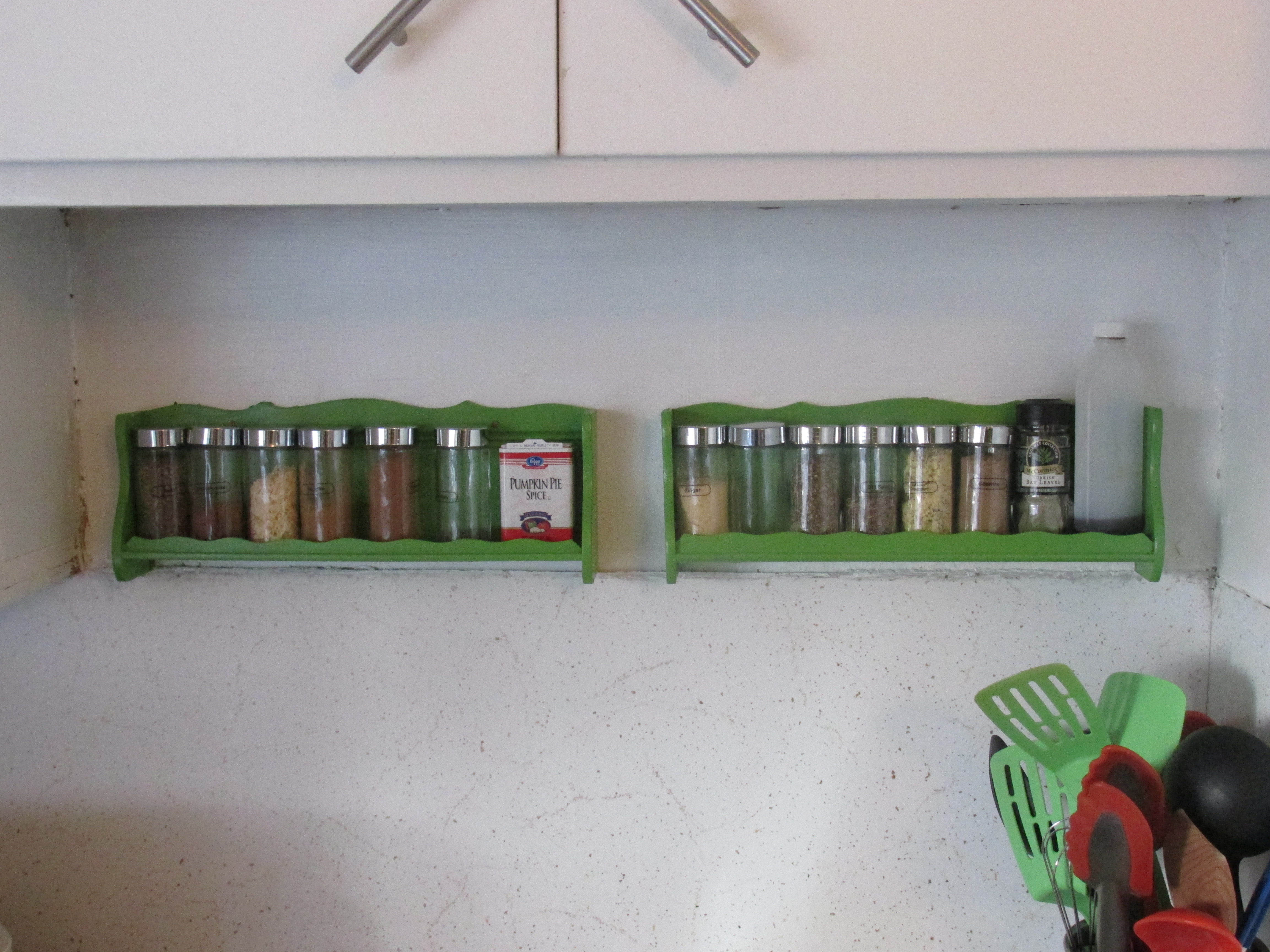 When we moved here, we inherited a lot of ancient junk. Most of it was just junk, but there were a few fun finds. They included a couple of small shelves that I held onto even though my husband tried to throw them away twice. I had a vision for them. With a coat of paint and a couple of nails, they would be awesome spice racks.