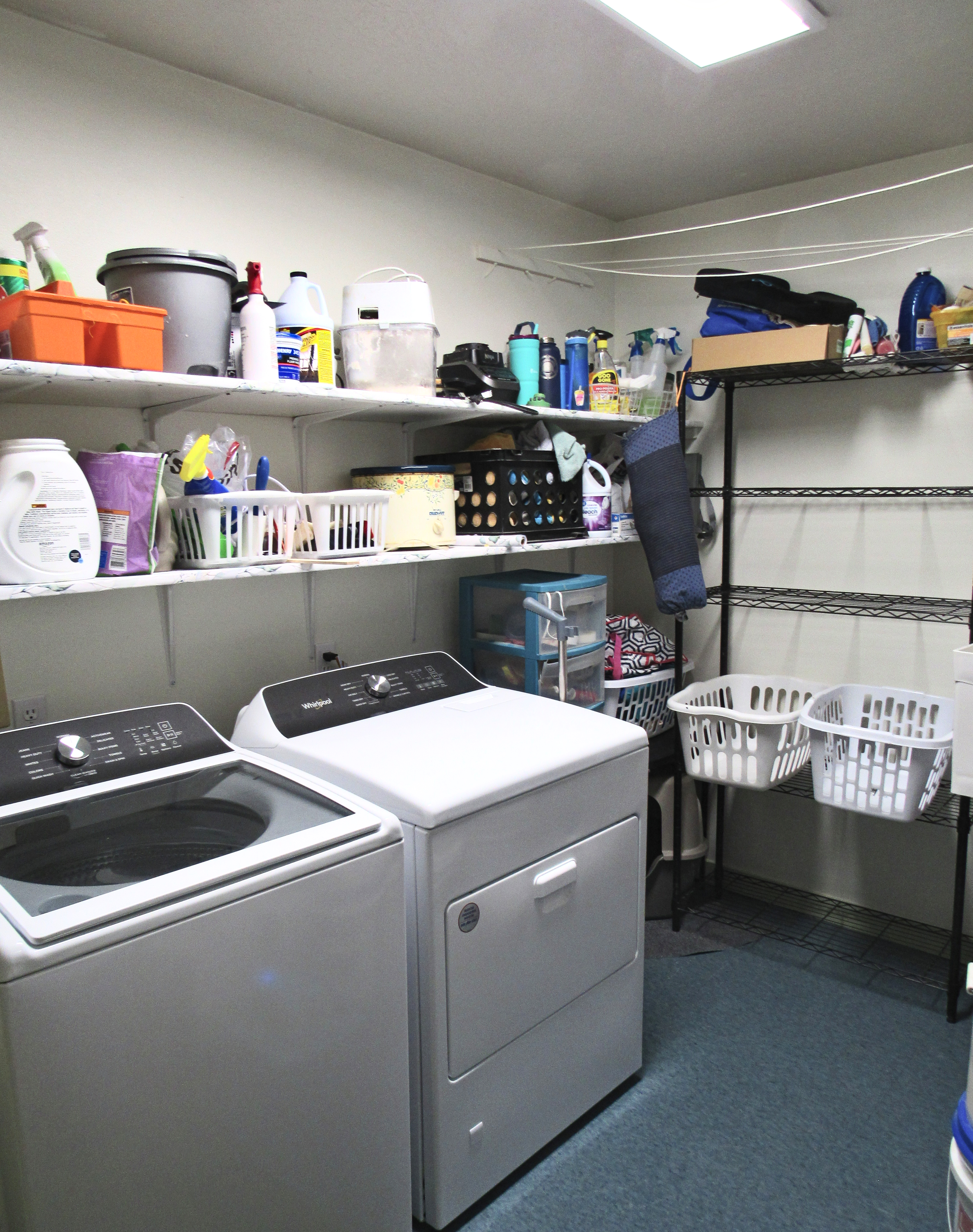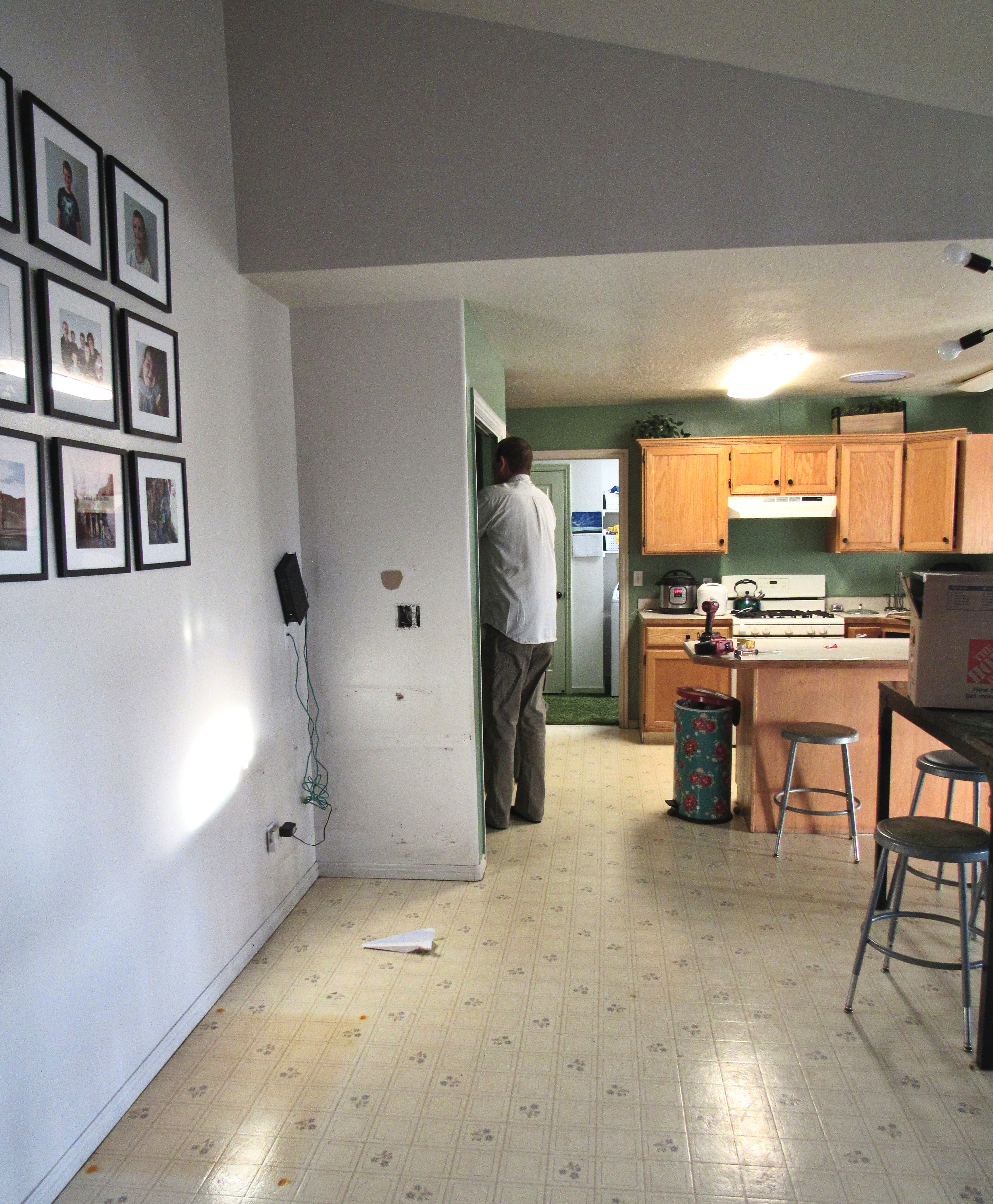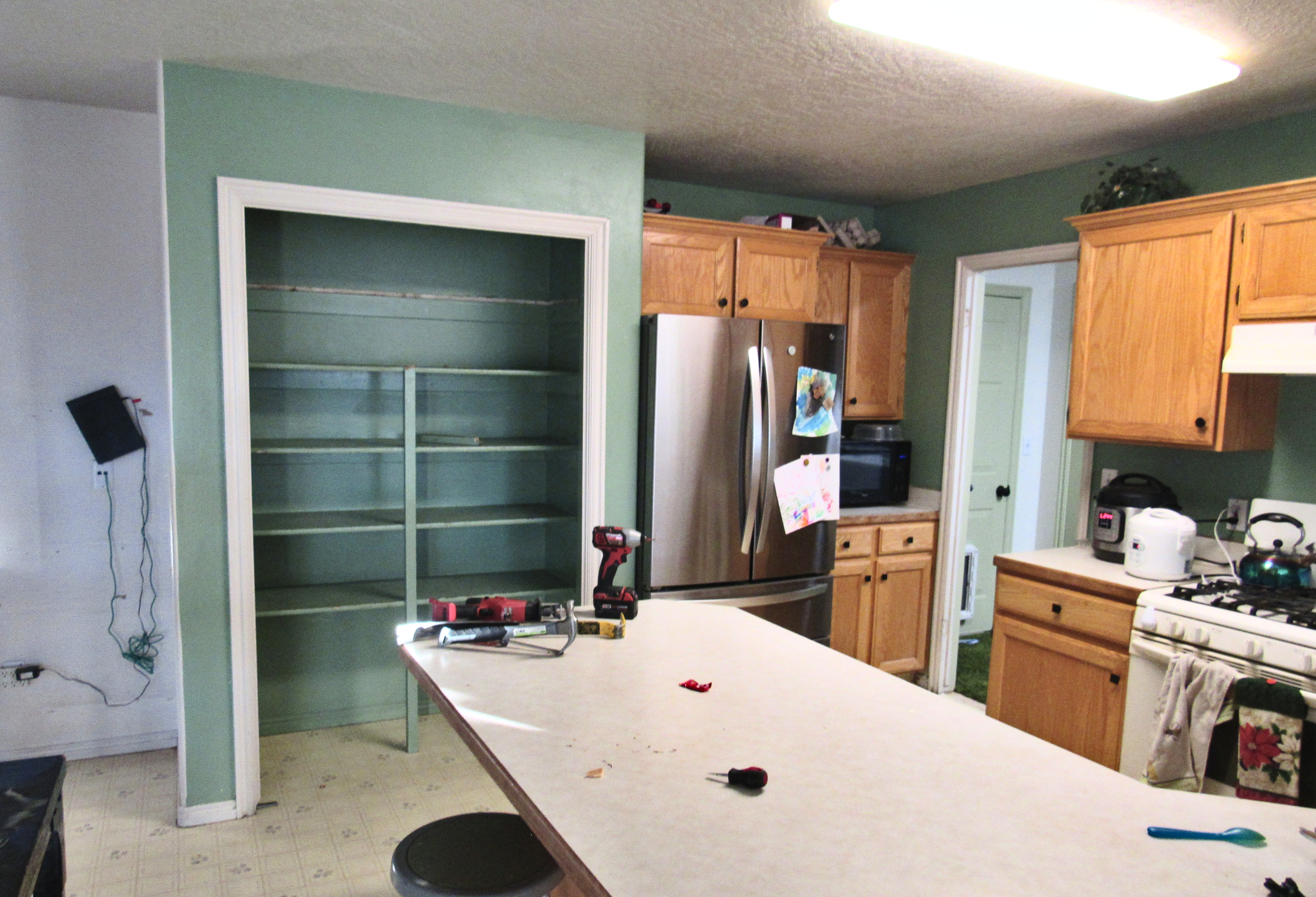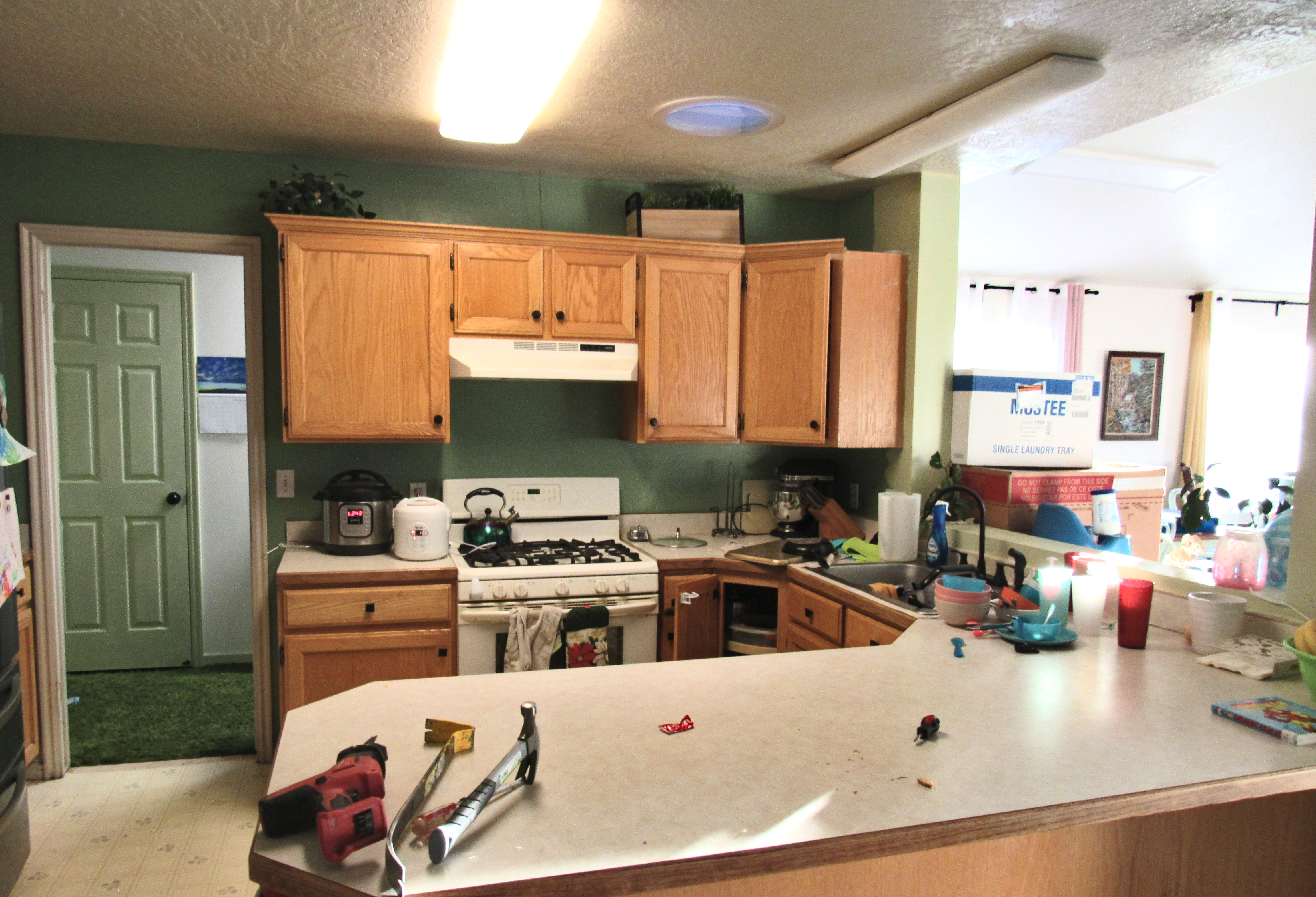 We started to upgrade the house. We just finished a big addition to the house, but now we have to take the old part and upgrade it. The floor has holes, the cabinets also have holes, and everything looks about the same as it did thirty years ago. We started with the laundry room. I wish I had before pictures, but I don’t. Here’s after. And I’m a real-life person who does things to live in not look pretty in pictures. The laundry room is a bit cluttery with stuff from the pantry we tore down, and because of life. The kitchen was also not even remotely staged, but here are the before pictures for later.