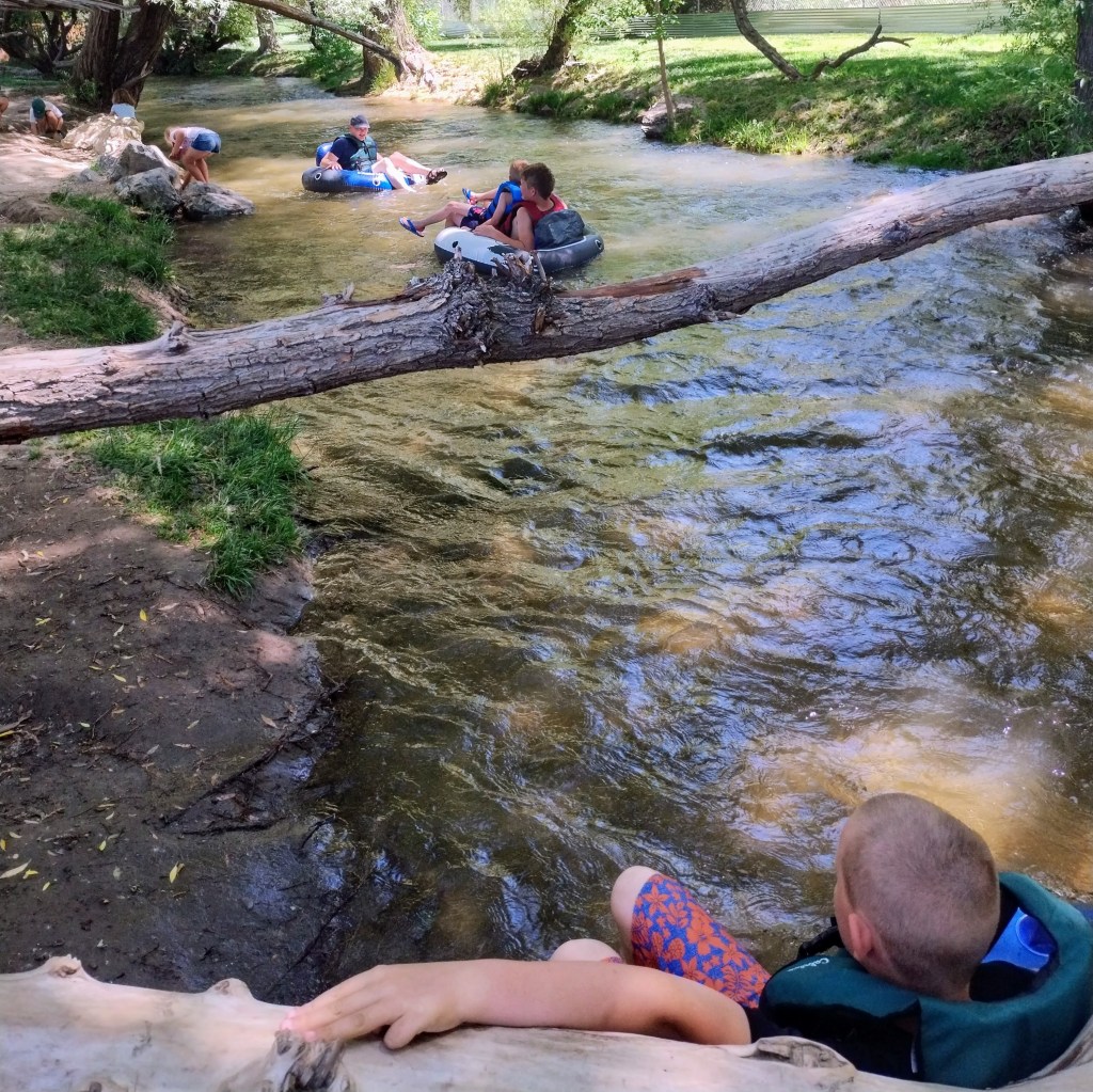 We’ve gone swimming, visited the library, and played at the park. Joe and I went on an anniversary date and went to the movies, and down to the Krishna temple. We hiked to a waterfall with friends. And we tubed down Dry Creek at our local park. I’ve wanted to do this one for ages, but the water level at the park is usually too high or too low. We found a day that was just right. It was a shorter tubing run, but easy to walk about and repeat a few times.