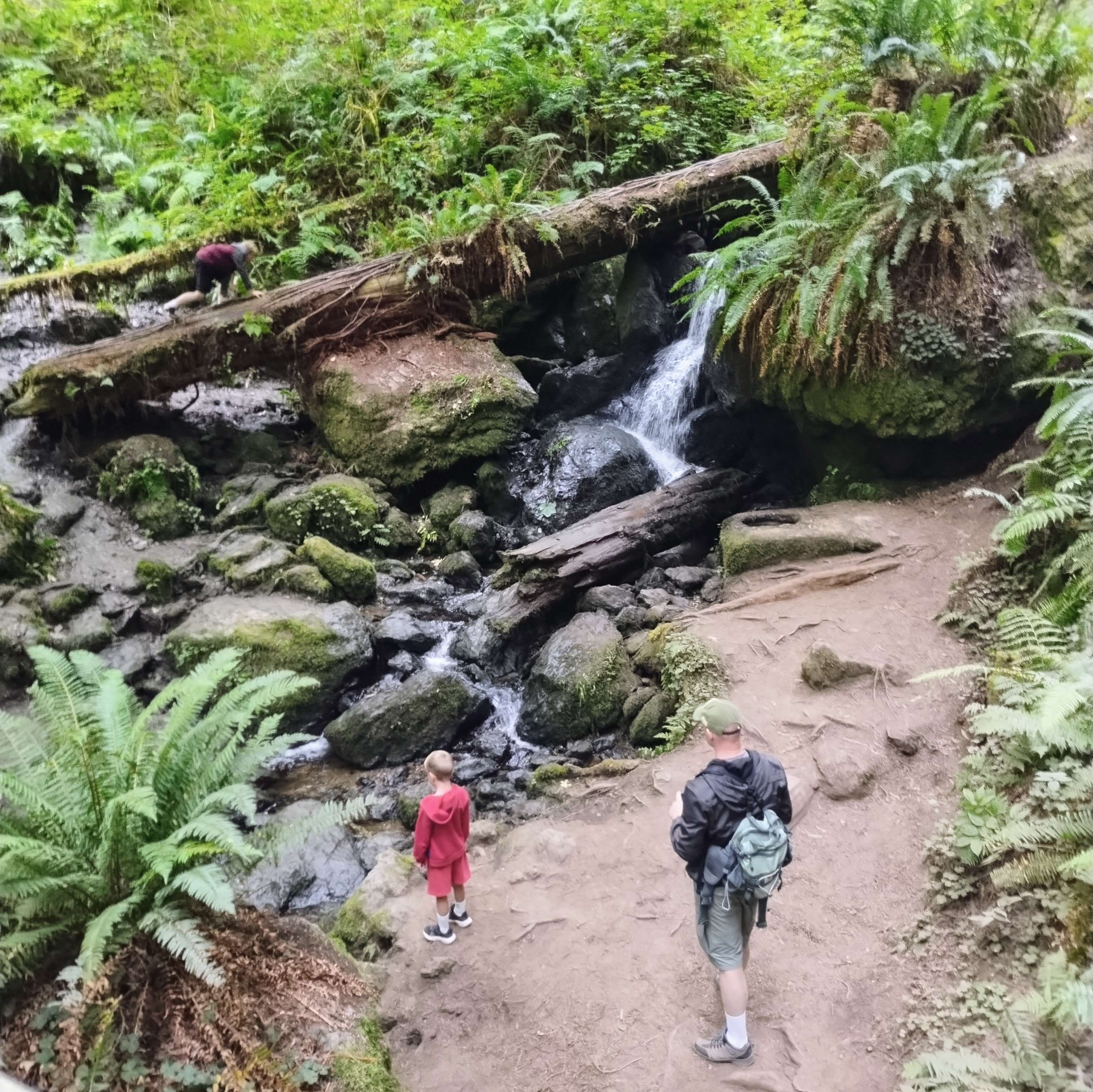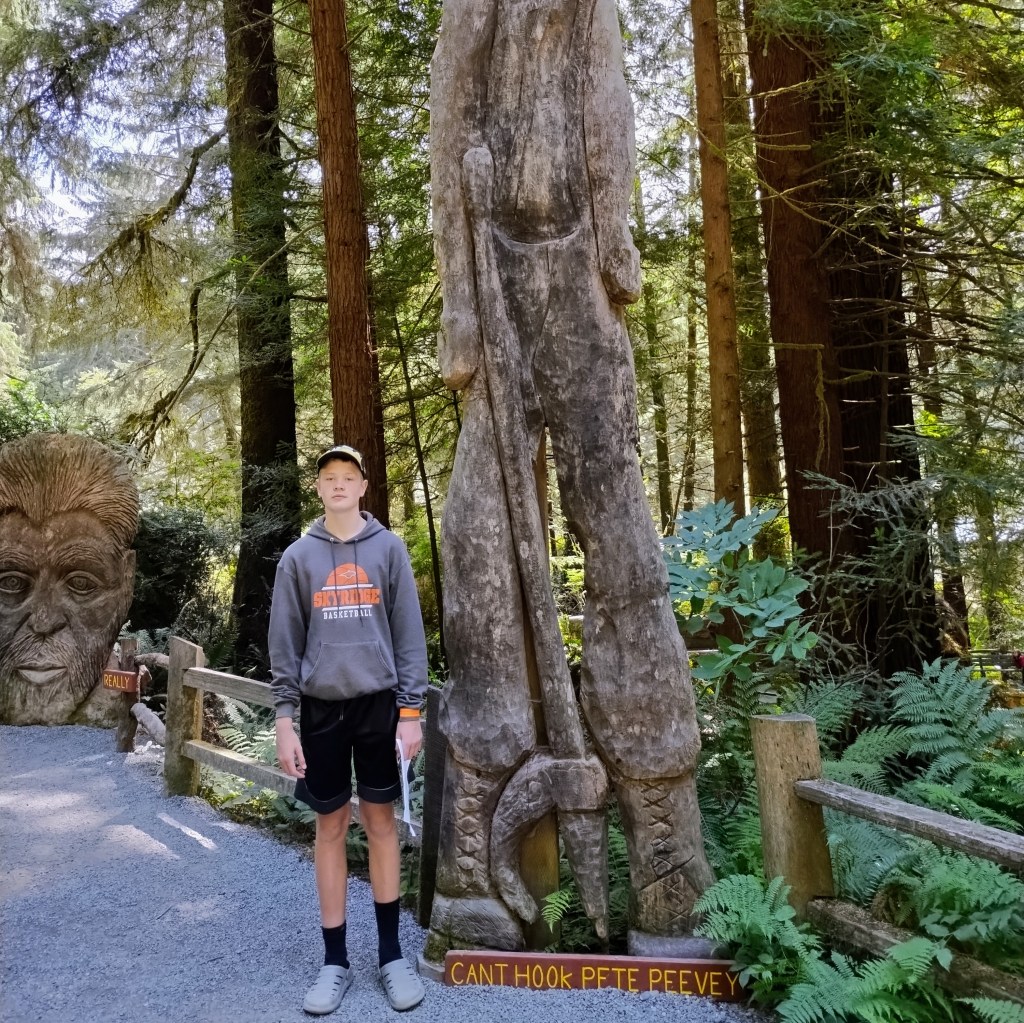 Day 4: Drove to the coast. We hiked to Trillium Falls, and then went to to tourist version of the redwoods at the Trees of Mystery. (It was actually rather fun, even if it was expensive.) Stopped by a beach briefly, and also did a short hike on the Boy Scout Tree trail. Finished the day at Harris Beach State Park to camp.