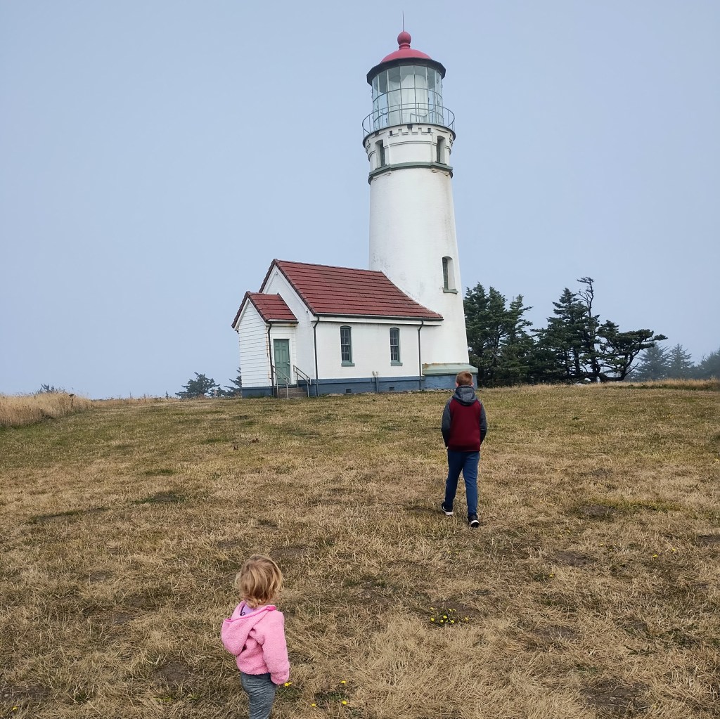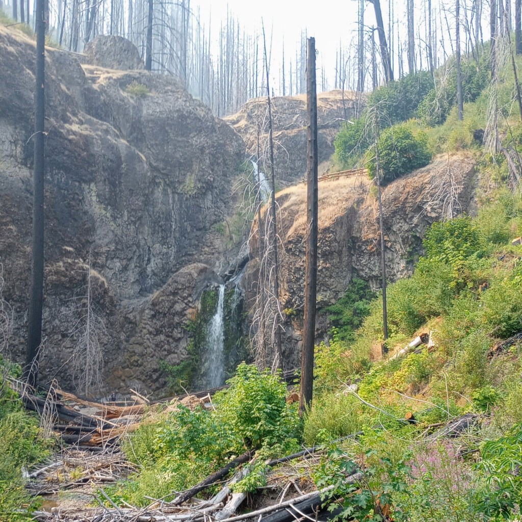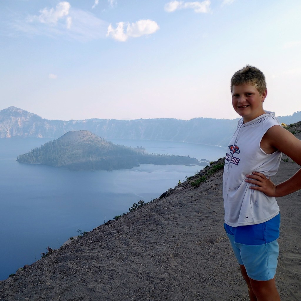 Day 6: Drove to Cape Blanco to see a lighthouse, and then headed inland again. We hiked Fall Creek Falls. That was a hot hike, but luckily a good pool to play in at the waterfall. The area we drove across for the next couple of days had a lot of smoke due to wildfires, and many areas were closed. We camped at Crater Lake. We briefly got a view of Crater Lake, but mostly it was too smoky to enjoy.
