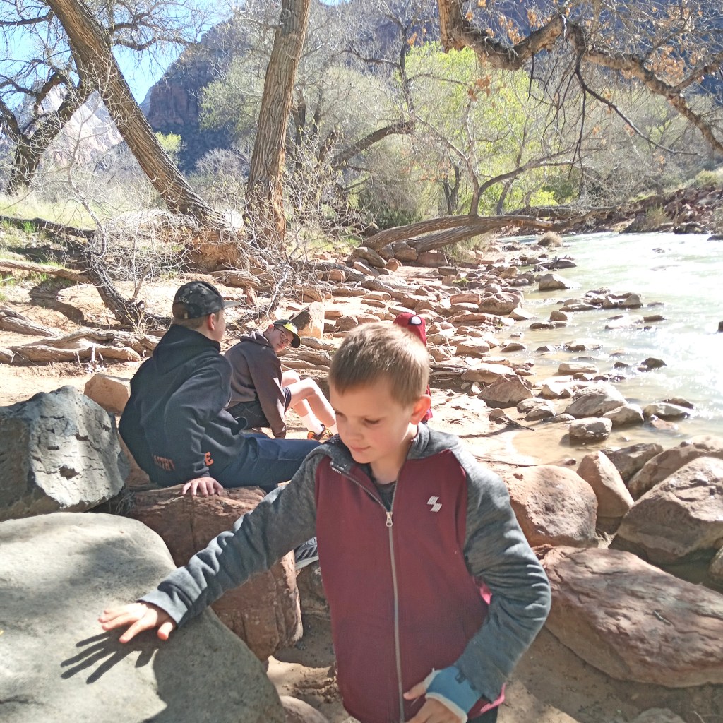 We did not board the shuttle bus or do any of the popular hikes. We parked a bit down the road and went to the visitors center which was super busy. But down by the river, just a few yards away from the crowd, there was hardly anyone about it that was really pretty. We drove through the tunnel, enjoyed some viewpoints, as well as parked by the side of the road, and explored some rocks and sand near the east entrance. There were actually some pretty things to do that no one was doing because they weren’t listed in a tour guide.
