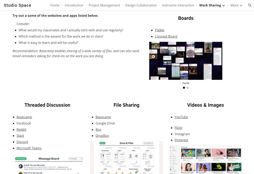 For my first project, I developed an online website that explains the importance of social interaction in design coursework that is traditionally taught in a studio environment. The website is available here.