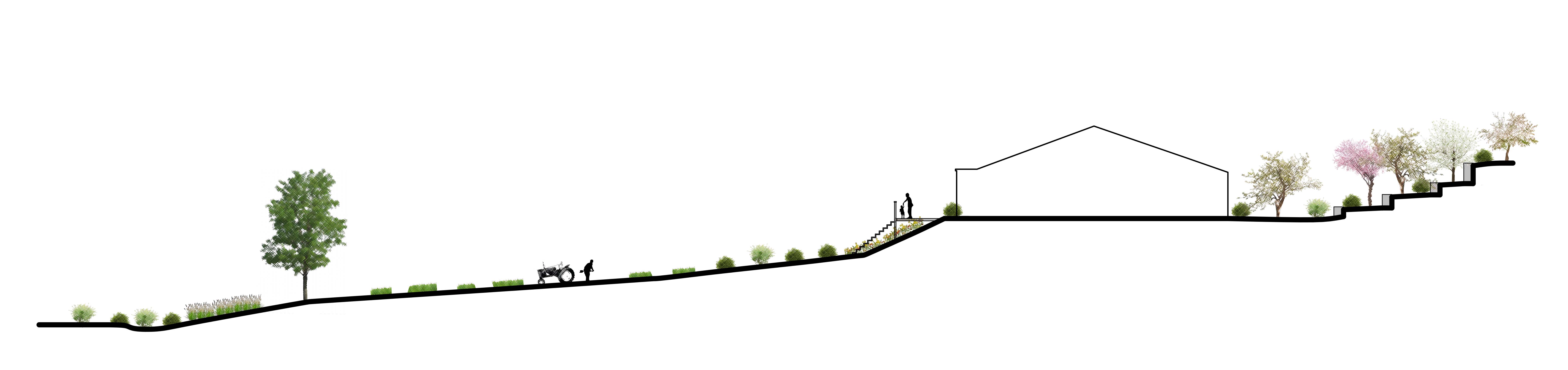 Utilizing the complex slope of the site, this landscape segregates and barn and greenhouse area from the residence, and allows for fruit trees, crop production, and beautiful flower gardens.